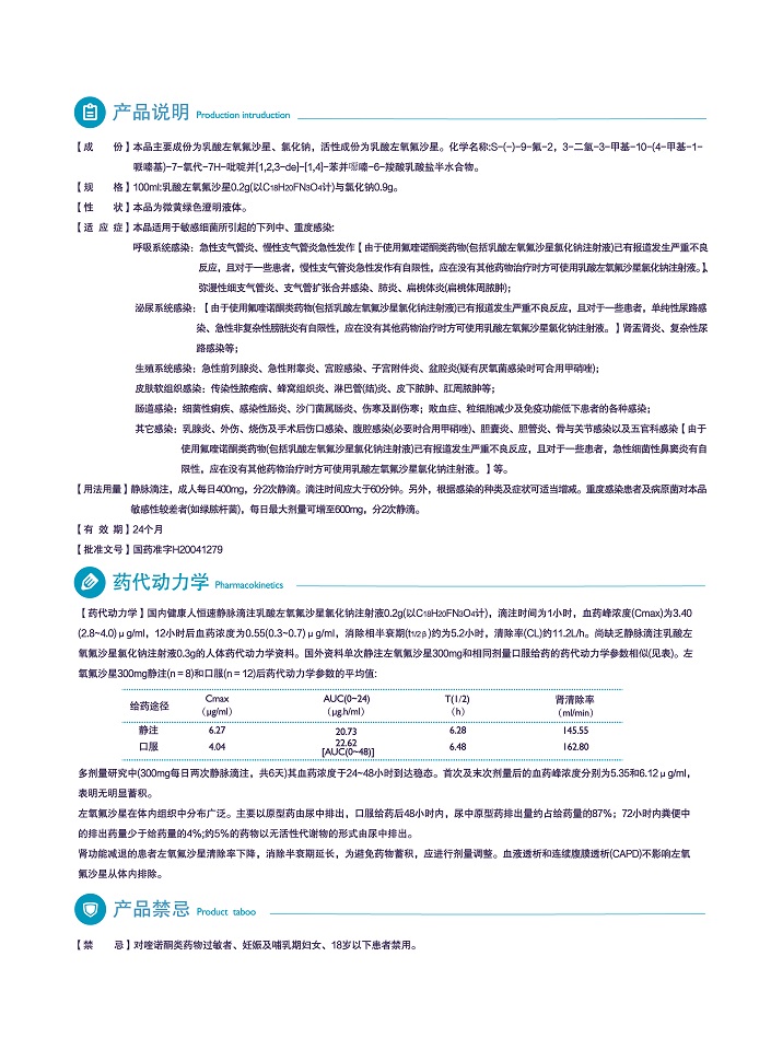 【成 份】本品主要成份為本品活性成份為乳酸左氧氟沙星、氯化鈉,活性成份為乳酸左氧氟沙星。