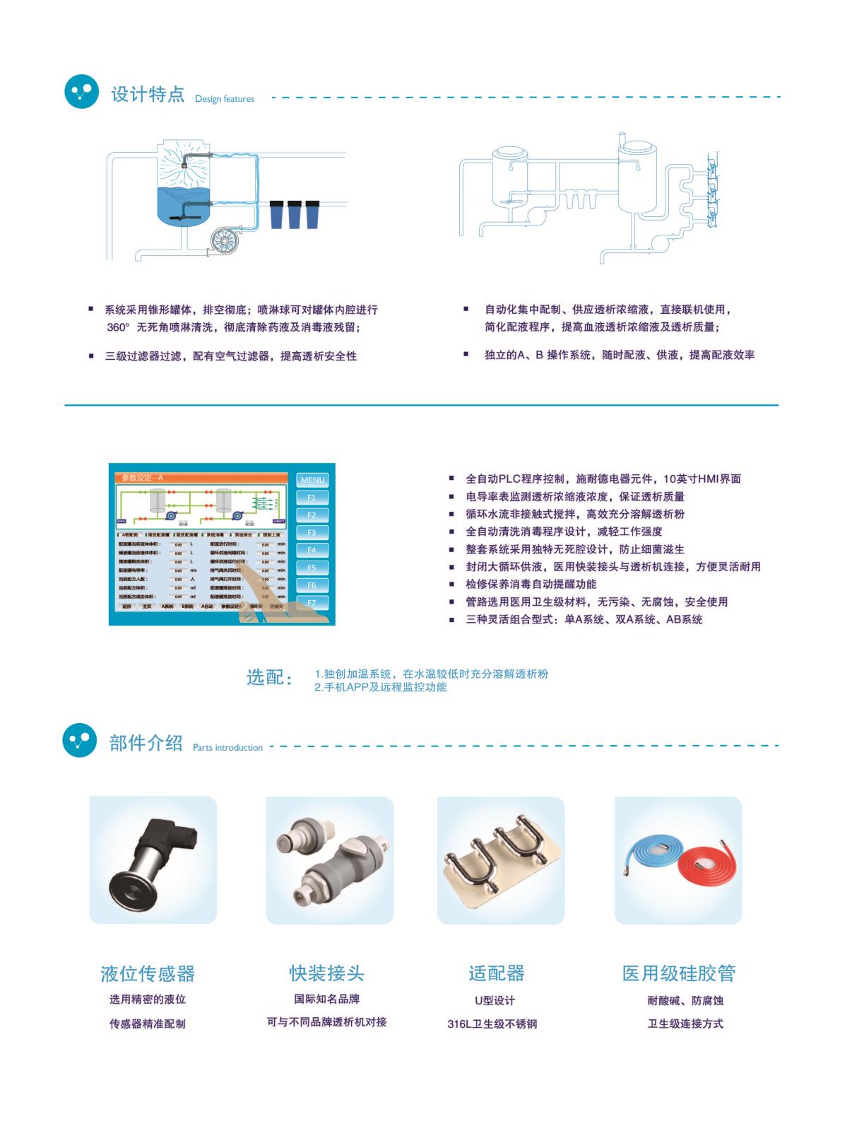 自動(dòng)化集中配制、供應(yīng)透析濃縮液,直接聯(lián)機(jī)使用,簡化配液程序,提高血液透析濃縮液及透析質(zhì)量