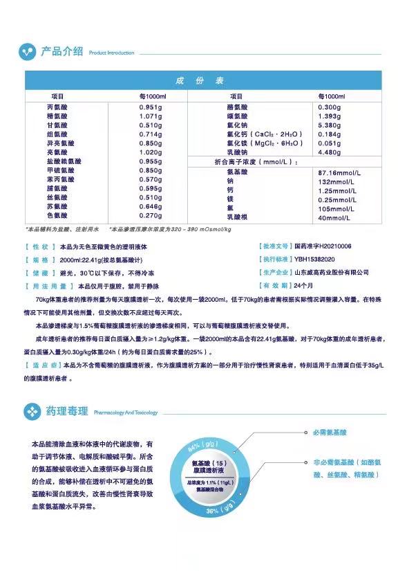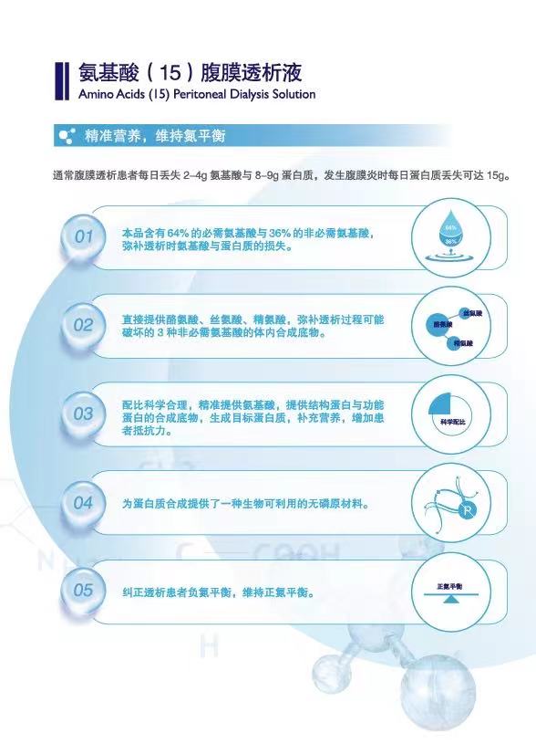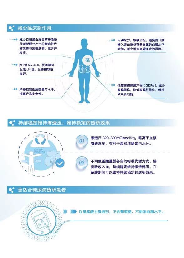 【適 應(yīng) 癥】本品為不含葡萄糖的腹膜透析液,作為腹膜透析方案的一部分用于治療慢性腎衰患者,特別適用于血清蛋白低于35g/L的腹膜透析患者